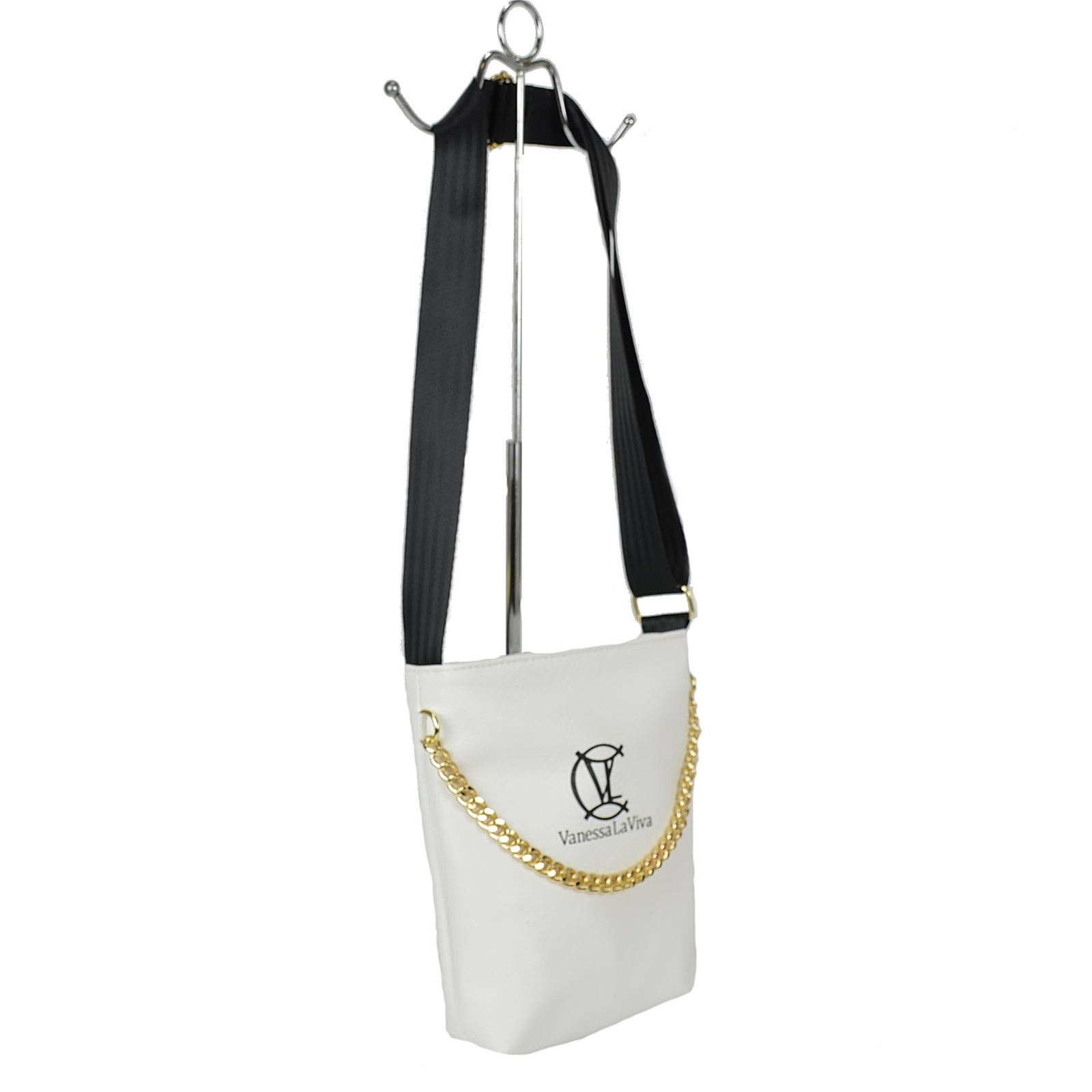 Ozdobiona łańcuszkiem w złotym kolorze oraz złotym znaczkiem z logo.
